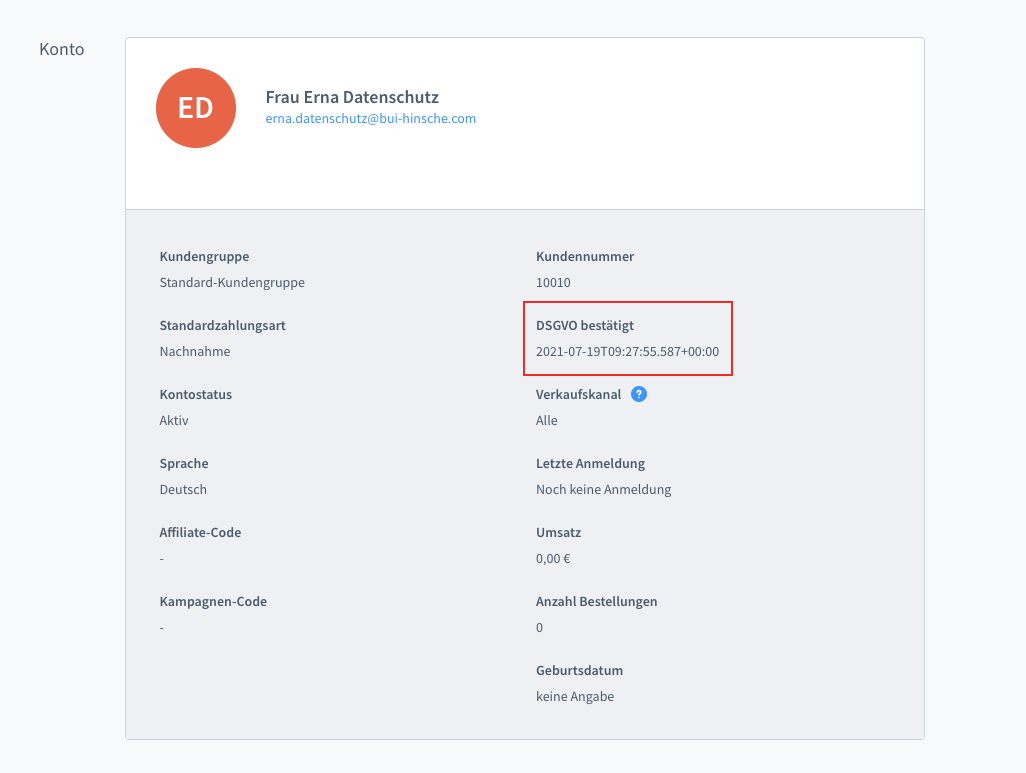 Bei der Registrierung im Shop müssen Ihre Kunden aktiv oder passive bestätigen, die Datenschutzhinweise gelesen und akzeptiert zu haben. Mit Hilfe des Plugins können Sie den genauen Zeitpunkt, an dem sie dies bestätigt haben, dokumentieren. Die Ausgabe erfolgt im Kundenkonto im Admin.