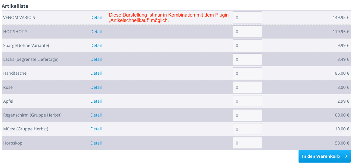 Durch das Plugin "Artikelliste in Einkaufswelten" kannst du z. B. Artikel als Liste in deiner Einkaufswelt darstellen. Alternativ dazu können diese auch als Listing dargestellt werden. Der große Vorteil gegenüber den Standarddarstellungsmöglichkeiten von Artikeln in den Einkaufswelten liegt darin, dass diese als Liste ausgegeben werden können. Sofern das Plugin "Artikelschnellkauf" aktiv ist, kann man sogar direkt aus der EKW heraus alle Artikel mit einem Klick in den Warenkorb gelegt werden. Somit gestalten Sie den Einkauf für Ihren Kunden noch effektiver.
