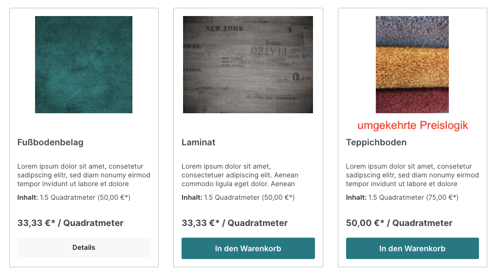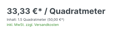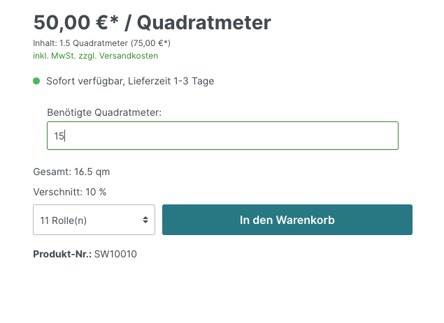 Es bietet die Möglichkeit, die benötigte Menge in die Verpackungseinheit umzurechnen. Bisher wurde und wird das Plugin vorrangig zur Berechnung von Bodenbelägen verwendet, da man hier oft nur im Paket kaufen kann. Damit dein Kunde nicht selbst die benötigten Quadratmeter in Pakete umrechnen muss, gibt es unser Plugin. Er, der Kunde, muss nur noch eingeben wieviel er benötigt und das Plugin rechnet diese Angabe in die dafür benötigten Verpackungseinheiten um. Dies kann für alle Artikel, für einzelne Artikel oder für bestimmte Maßeinheiten aktiviert werden. Damit bist du komplett flexibel. Zusätzlich ist es z. B. für die Verwendung bei Fußbodenberechnungen möglich, einen Verschnitt einkalkulieren zu lassen. Wie hoch dieser ist, legst du im Admin selbst fest. Diese Möglichkeit besteht pro Produkt, pro Maßeinheit oder generell für alle gleich. Dabei kannst du nochmals unterscheiden ob dieser Aufschlag pauschal oder prozentual erfolgen soll. Das alles ist auch für Varianten möglich. Du entscheidest, ob die Einstellungen vom Hauptartikel auf die Varianten übernommen werden, oder ob du diese pro Variante abweichend hinterlegen möchtest. Generell ist das Plugin pro Verkaufskanal aktivierbar.