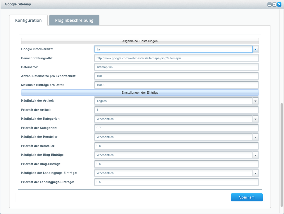 - Für Artikel, Kategorien, Hersteller und Blog-Artikel lassen sich Prioritäten und Aktualisierungs-Häufigkeiten festlegen.
