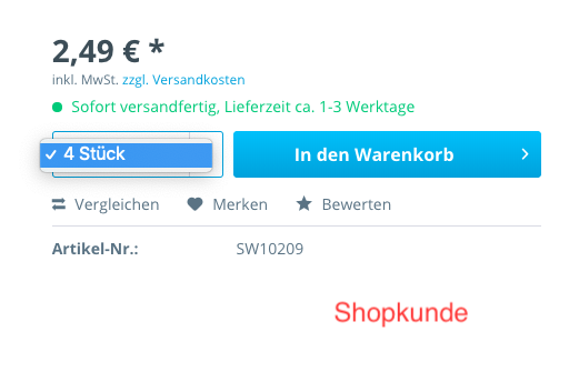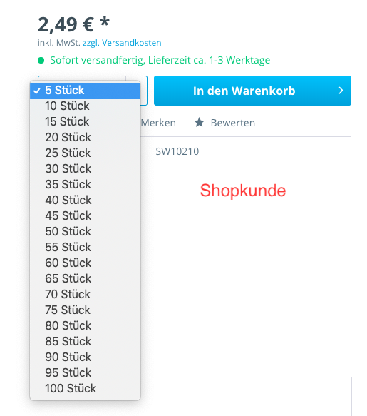 Abgesehen von diesen unterschiedlichen Verpackungseinheiten, kannst du es auch lediglich als Artikelmengenstaffelung einsetzen. Du legst einfach fest ob der Kunde z. B. nur in Fünferschritten (5,10,10, ...) kaufen darf. Er kann mit dieser Einstellung nicht mehr 4 Stück in den Warenkorb legen, da das Dropdown dies unterbindet. Eine einzige Ausnahme stellen dabei die Abverkaufsartikel dar. Wenn es nur noch einen Restbestand gibt, der unterhalb der Staffel liegt wird dieser in den Warenkorb gelegt. Auch diese Staffelung kann pro Kundengruppe angewendet werden. Aber Achtung, da beim Lagerbestand nur eine Zahl hinterlegt ist, bedeutet dies bei Shopkunden können noch 4 Stück, bei Händlern 4 Pakete und bei Resellern 4 Paletten gekauft werden!