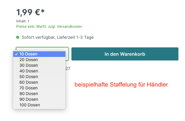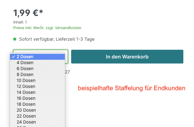 Immer wieder sind wir nach der Möglichkeit gefragt worden, ob es nicht möglich ist pro Kundengruppe unterschiedliche Artikelmengen anzubieten. Im Detail heißt das, dass z. B. Endkunden eine pro Stück-Staffelung erhalten - Gewerbekunden aber immer nur z. B. 12,24,36, ... Stück abnehmen dürfen. Ohne das Plugin ist es nur über einen zweiten Verkaufskanal zu realisieren, was jedoch unnötige Zeit und Kosten sind, da alles doppelt gepflegt werden muss. Diese Staffelung kannst du pro Artikel festlegen. Somit bist du extrem flexibel was die Gestaltung der Artikelmengen bzw. wie viel der Kunde (pro Kundengruppen)bestellen kann und muss.