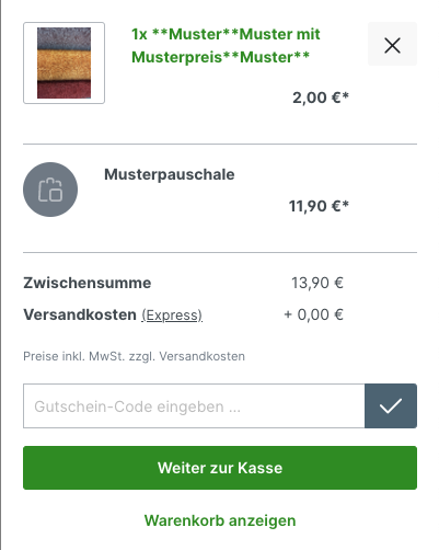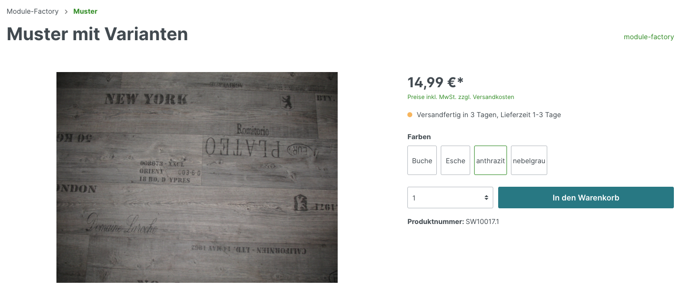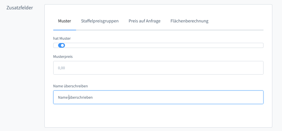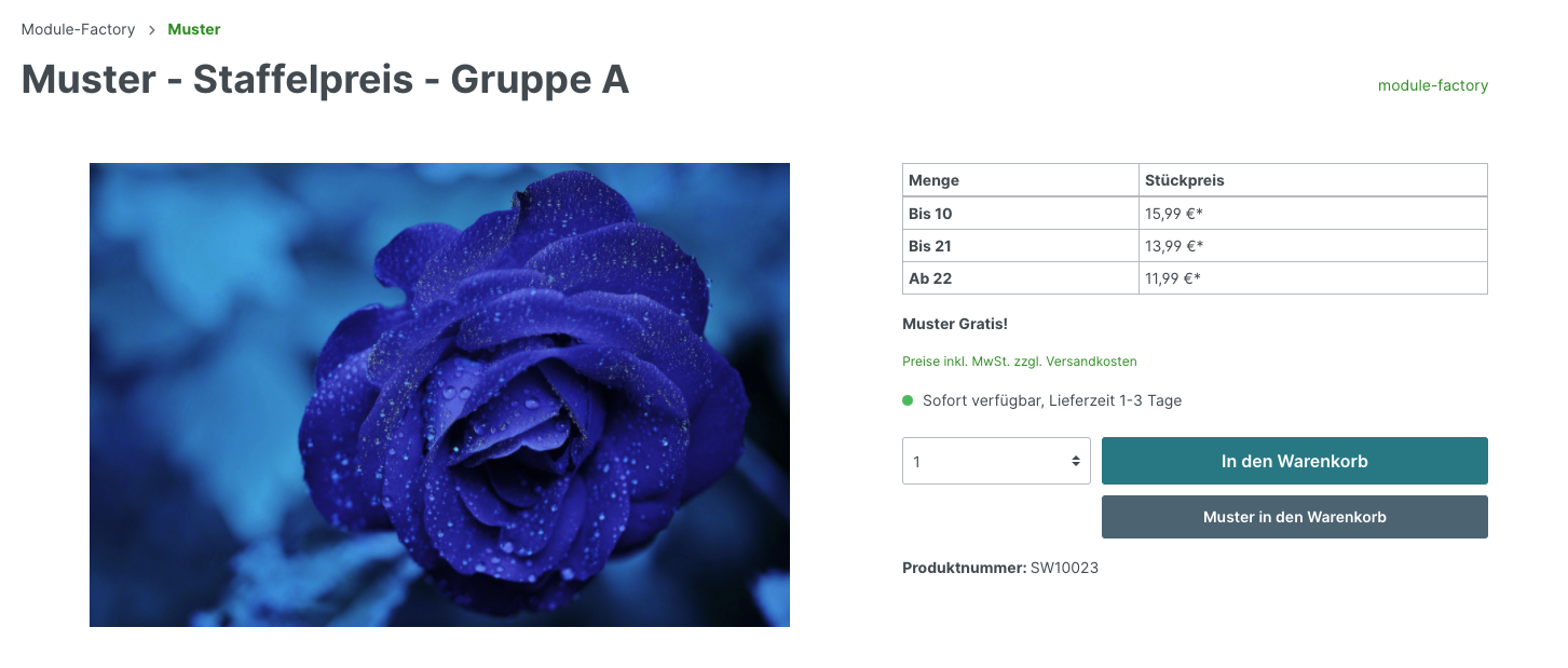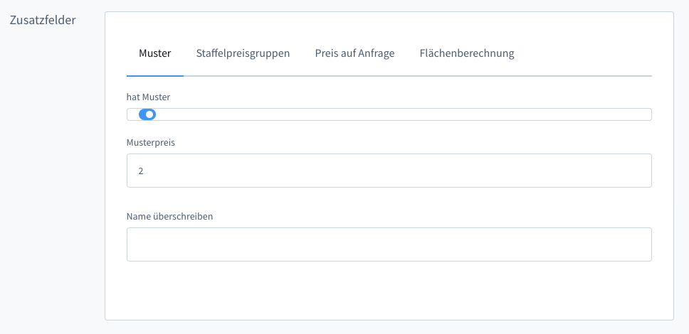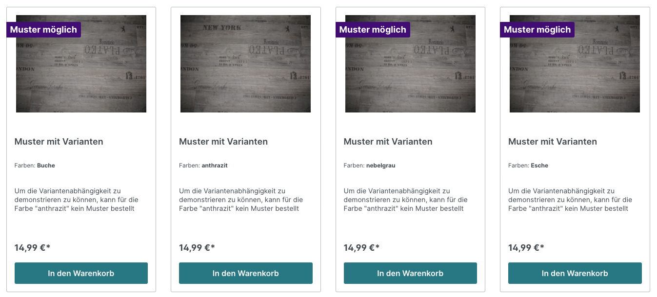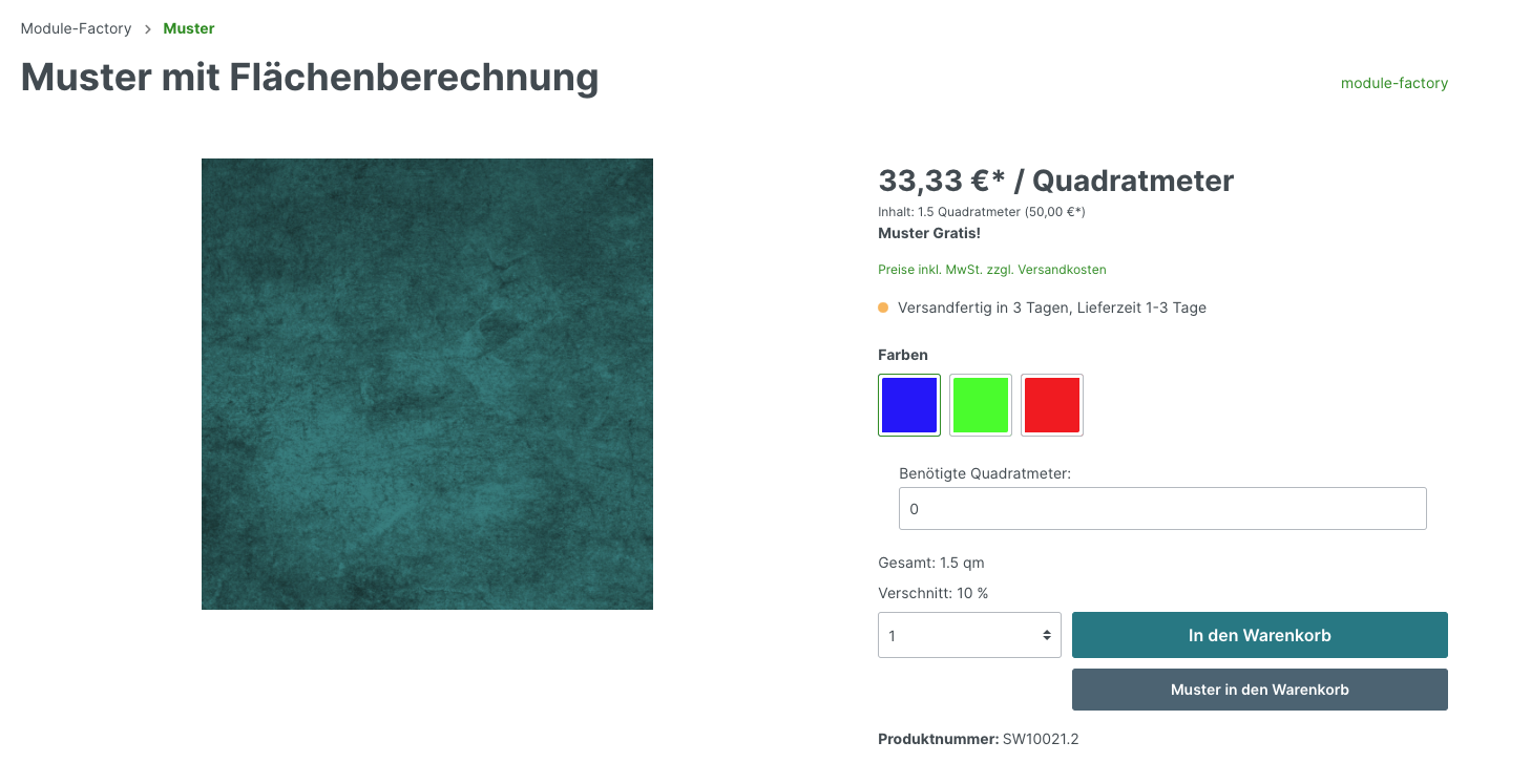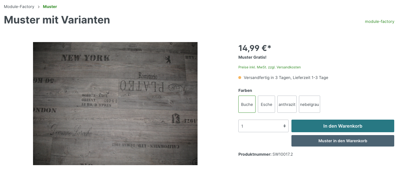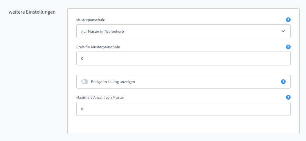 Es bietet die Möglichkeit für bestimmte Artikel Muster anzubieten. Generell kann das Plugin pro Verkaufskanal aktiviert werden. Um Musterartikel im Warenkorb bzw. bei der Bestellung bereits namentlich zu unterscheiden, gibt es die Möglichkeit an den Artikelnamen bzw. an die Artikelnummer einen Präfix oder Suffix zu ergänzen. Zudem kann eine Pauschale für Musterartikel festgelegt werden. Bei dieser kann unterschieden werden ob die Pauschale berechnet wird, wenn nur Muster im Warenkorb enthalten sind oder wenn mindestens ein Muster enthalten ist. Der Preis für diese Pauschale ist frei definierbar. Um dem Kunden bereits im Listing zu signalisieren, dass eine Musterbestellung möglich ist, kann der Badge aktiviert werden. Um Missbrauch von Musterbestellungen vorzubeugen, ist es möglich die Anzahl der Muster pro Bestellung zu begrenzen.
