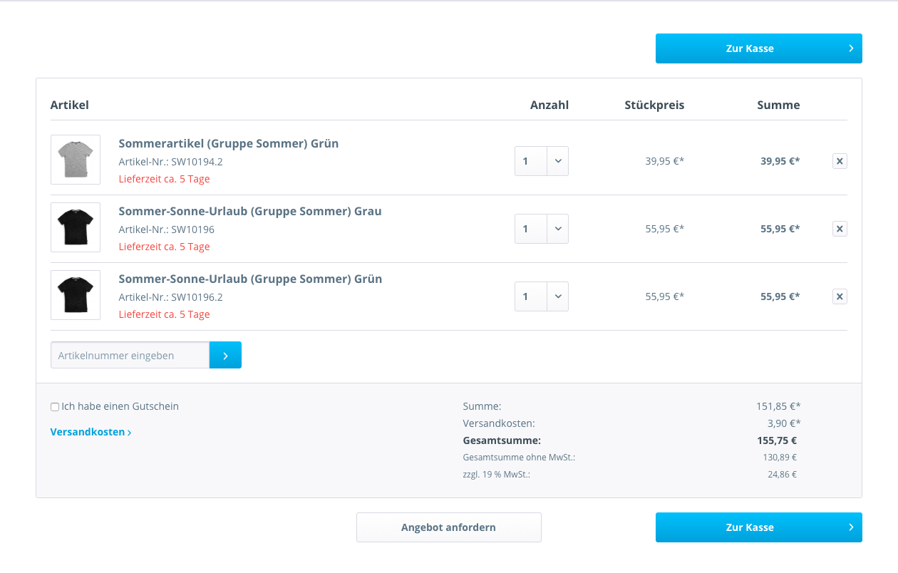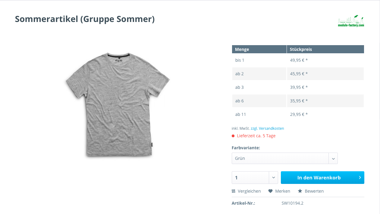 Im Shopstandard ist es möglich einzelnen Artikeln eine Mengenstaffelung und damit günstigere Preise zuzuordnen. Das könnte z. B. so aussehen: