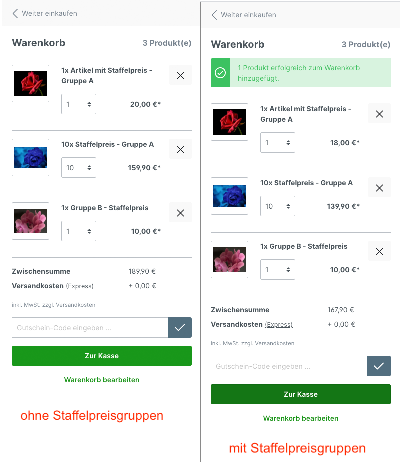 Mit dem Plugin Staffelpreisgruppen ist es möglich Artikelmengen im Warenkorb zusammenzufassen um die Artikelstaffelpreise mit der gemeinsamen Menge zu berechnen. Somit schaffst du mehr Anreiz mehr zu kaufen und somit steigerst du die Umsätze.