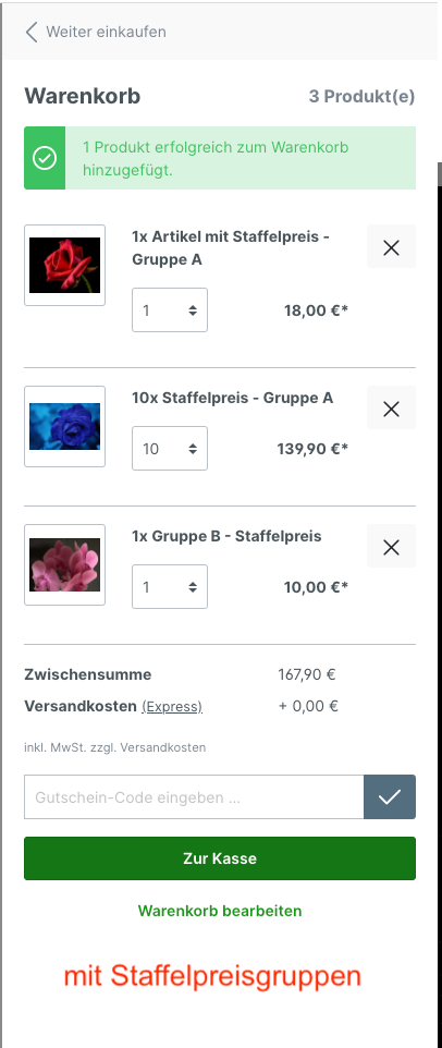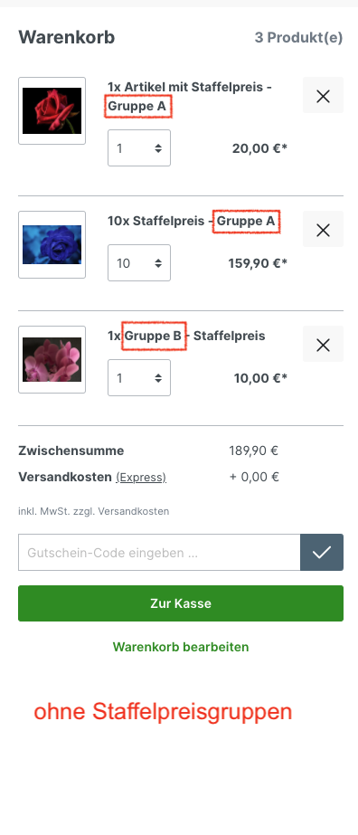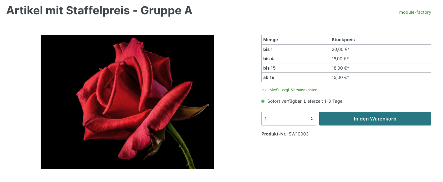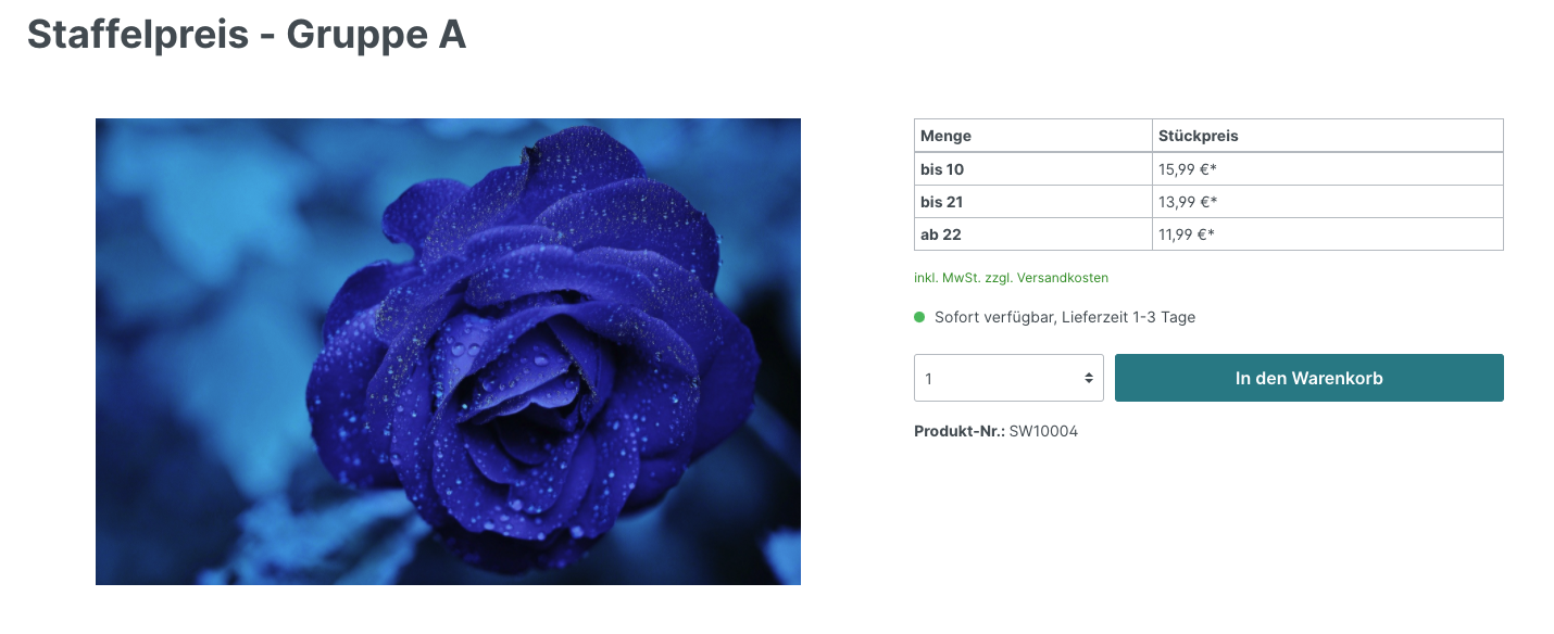 Mit unseren Plugin ist es jedoch möglich verschieden Artikel zu einer Gruppe zusammenzusammen und diese Staffelung gruppenintern zu verwenden. Im Detail bedeutet das, dass wenn dein Kunde Artikel x, y und z kauft, und diese alle der Gruppe A zugewiesen sind, er den Mengenpreis für die Gruppe A erhält.