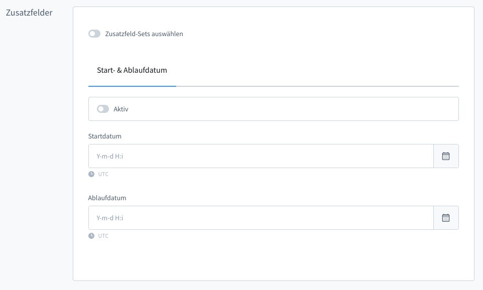Start- Ablaufdatum ermöglicht es dir, Artikel nur zu einer vorab festgelegten Zeitraum anzeigen zu lassen, zu einem bestimmten Tag zu aktivieren oder zu deaktivieren. Du kannst somit z. B. Saisonartikel bereits vor der Veröffentlichung im Admin anlegen und zum Tag x automatisiert aktiv schalten lassen. Gleiches kannst du zum Saisonende wieder deaktivieren. Du bist jedoch nicht festgelegt immer ein Start- und Ablaufdatum zu hinterlegen, du kann auch das eine ohne das andere hinterlegen.