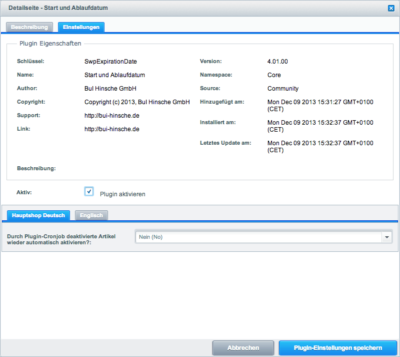 Mit dem Plugin Start- und Ablaufdatum können Sie für jeden Artikel individuelle Daten zur Aktivierung und Deaktivierung festlegen. Die Start- und Ablauf-Daten lassen sich bequem im Admin pflegen und werden vom Plugin als Cronjob angelegt.