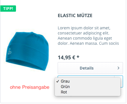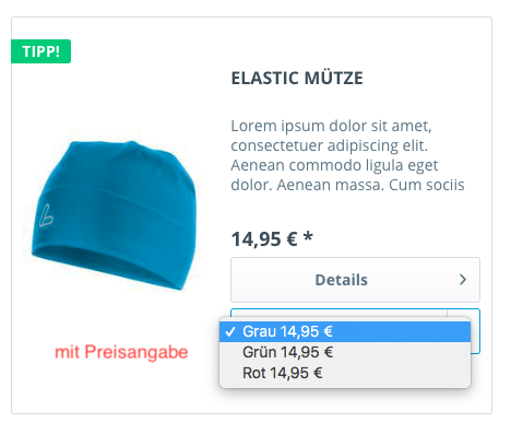 Variantenauswahl im Listing oder auch Produktvarianten im Listing genannt, ermöglicht es Dir ein- oder mehrdimensionale Produktvarianten im Listing darzustellen. Der große Vorteil diese Plugins liegt in der Ausgabe mehrdimensionaler Variaten. Die Darstellung im Frontend erfolgt als Dropdown. Somit ist eine übersichtliche Darstellung gerade von mehrdimensionalen Varianten garantiert. Dies beinhaltet selbstverständlich auch mobile Geräte.
