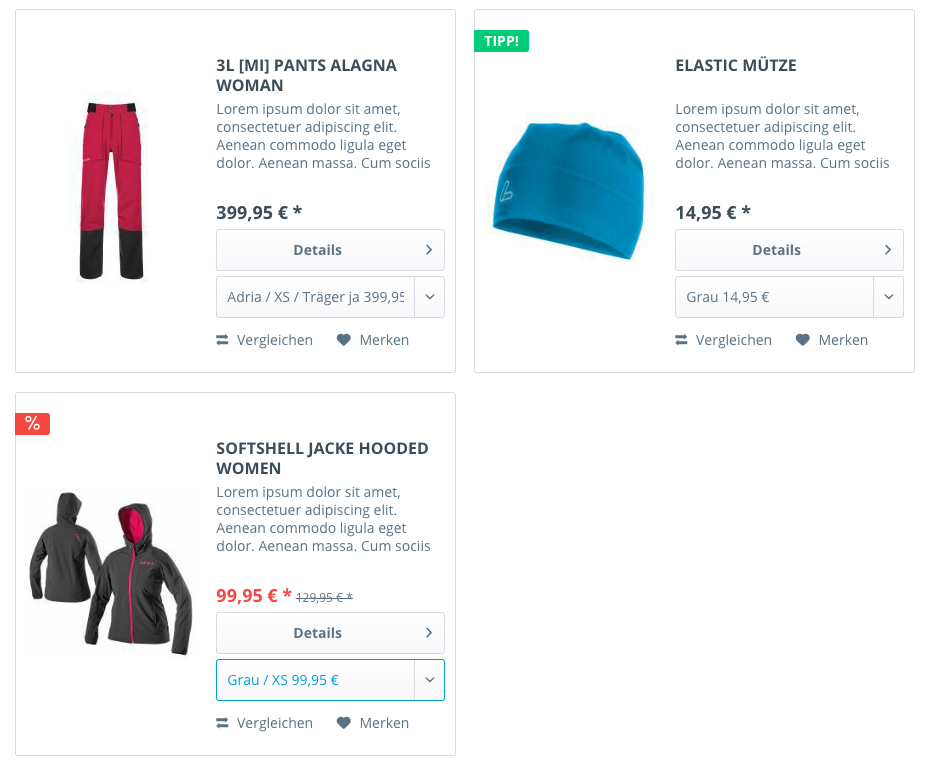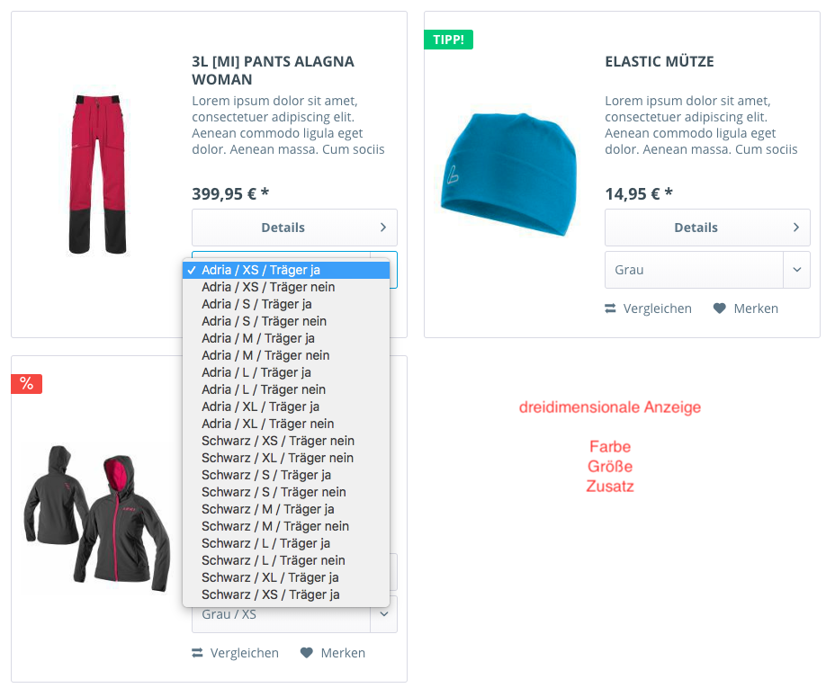 - Darstellung mehrdimensionaler Varianten im Listing z. B. Farbauswahl (rot, gelb, blau, ...) in jeweils unterschiedlichen Größen (S, M, L, ...) - daraus ergeben sich die Farb- Größenkombinationen (L-rot, L-gelb, L-gelb, ...) nach kombinatorischen Regeln