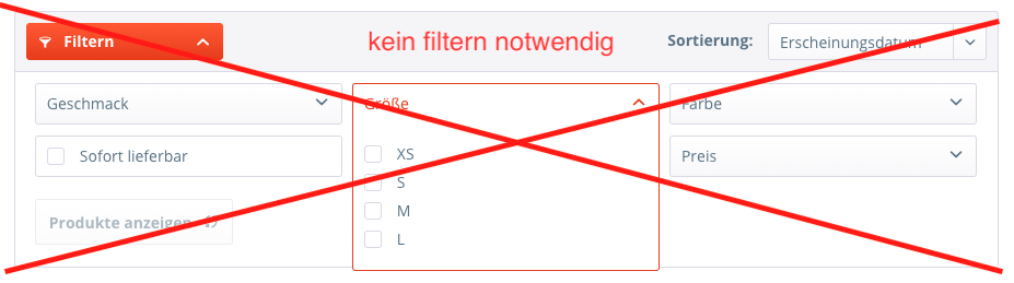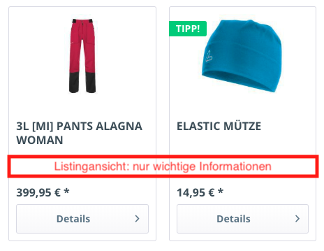 - Darstellung eindimensionaler Varianten im Listing z. B. ausschließlich Farbauswahl (rot, gelb, blau, ...)